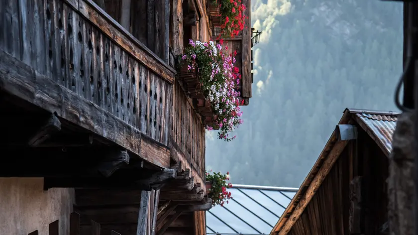 Gli stretti vicoli acciottolati si addentrano tra spazi imprevedibili dove legno e pietra si alternano senza gerarchie: scale esterne addossate alle facciate, ballatoi in larice scuriti dal tempo, parapetti traforati, travi a vista, porte consumate, immagini votive, piccole finestre ravvicinate, cataste di legna sotto le gronde, tetti che quasi si toccano lasciando filtrare lame di cielo.