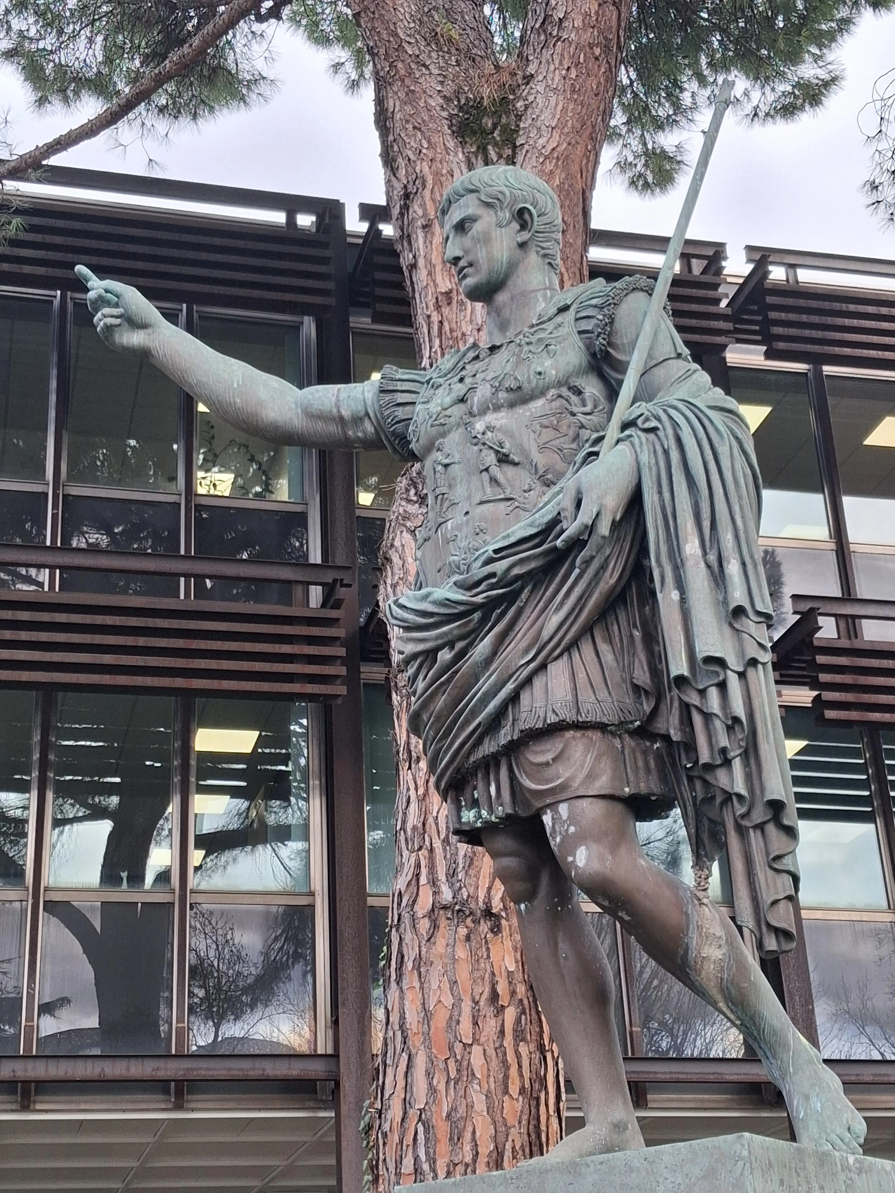 In via Roma, di fronte all’Auditorium punta a ovest il braccio bronzeo di Cesare Ottaviano Augusto; la statua fu portata da Pola dagli esuli istriani nel 1947, diventando simbolo di legame con la terra perduta.