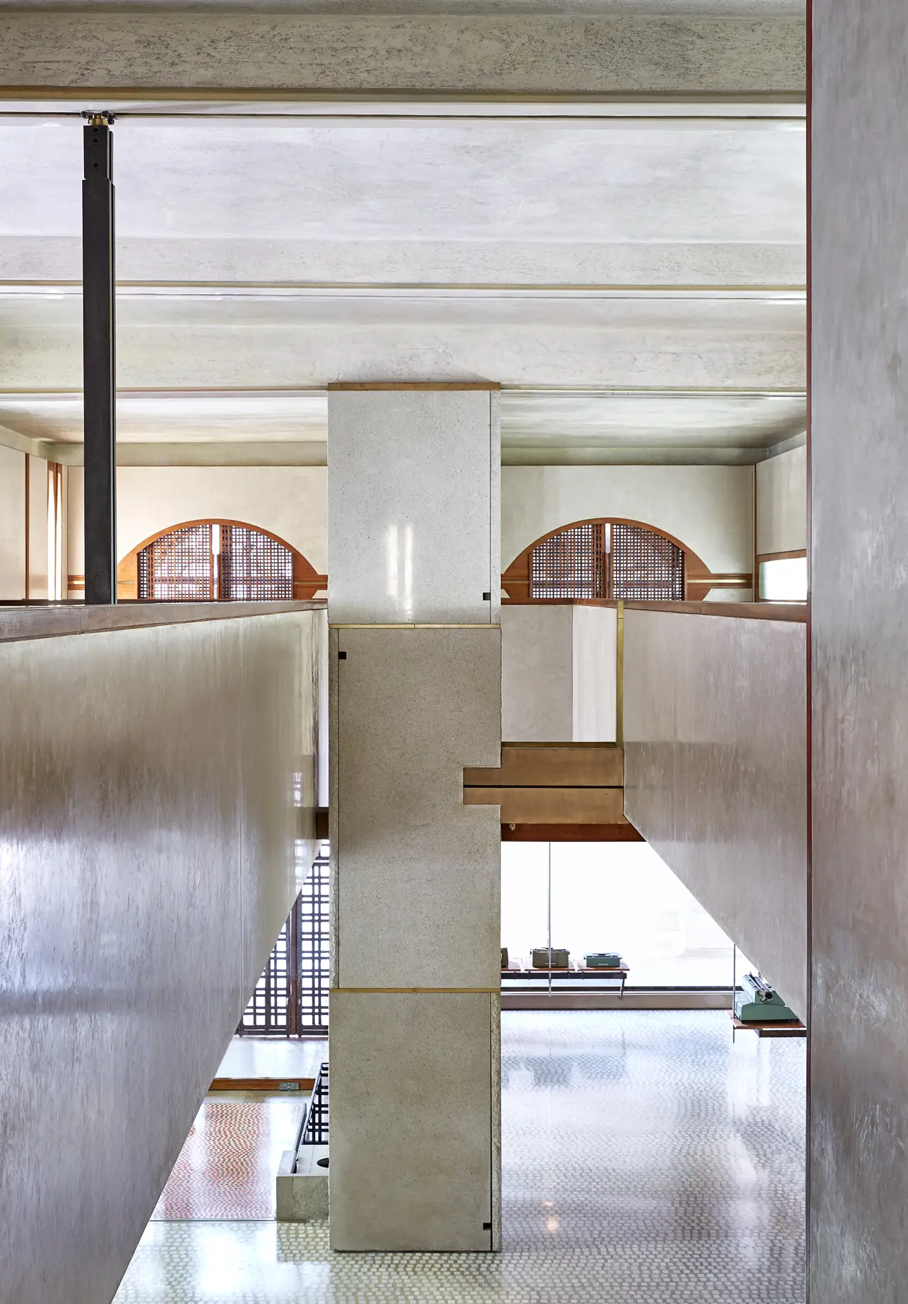Non un semplice showroom, ma la materializzazione dello “Stile Olivetti”: modernità senza arroganza, tecnologia in armonia con le forme, bellezza come parte integrante del lavoro. Scarpa colse la sfida con la sua attenzione scrupolosa al dettaglio, studiando l’incidenza della luce sulle superfici e orchestrando un insieme in cui materiali diversi dialogano con naturalezza: il marmo di Aurisina, i legni come il teak – tipico delle barche – e le tessere di vetro del pavimento, posate in modo irregolare per evocare un leggero velo d’acqua. Il cuore dello spazio è la celebre scala sospesa, una sequenza di gradini leggeri e stabili al tempo stesso, che pare staccarsi dal pavimento per accompagnare il visitatore al soppalco.