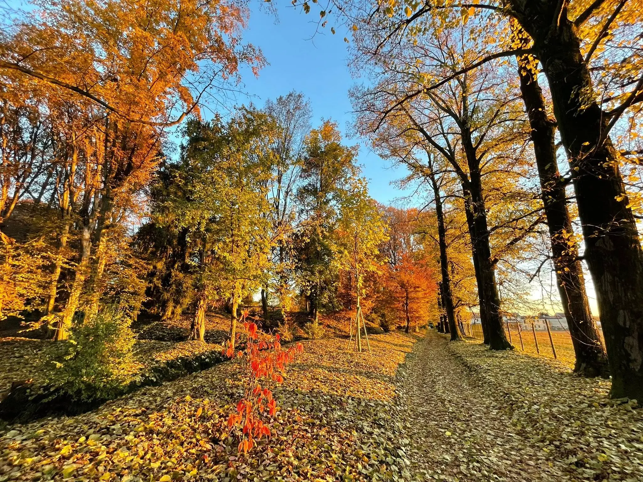 In autunno, quando l’osmanto diffonde il suo profumo e il parco si tinge d’oro e di ruggine, il complesso risplende di equilibrio, immerso negli ampi spazi che ne conservano la memoria agricola.
