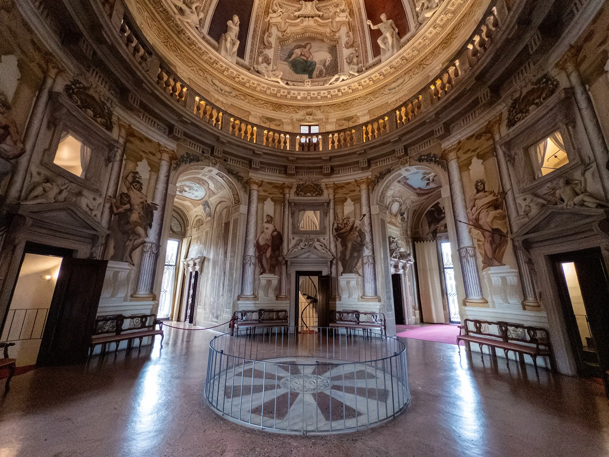 Ed è in questo teatro paesaggistico che prende posto l’invenzione destinata a Paolo Almerico, ecclesiastico vicentino rientrato dalla Roma pontificia e desideroso di una dimora appartata ma riconoscibile: un impianto quadrangolare, con gli angoli orientati verso i punti cardinali per temperare sole e venti, che accoglie una sala centrale circolare illuminata dall’alto.